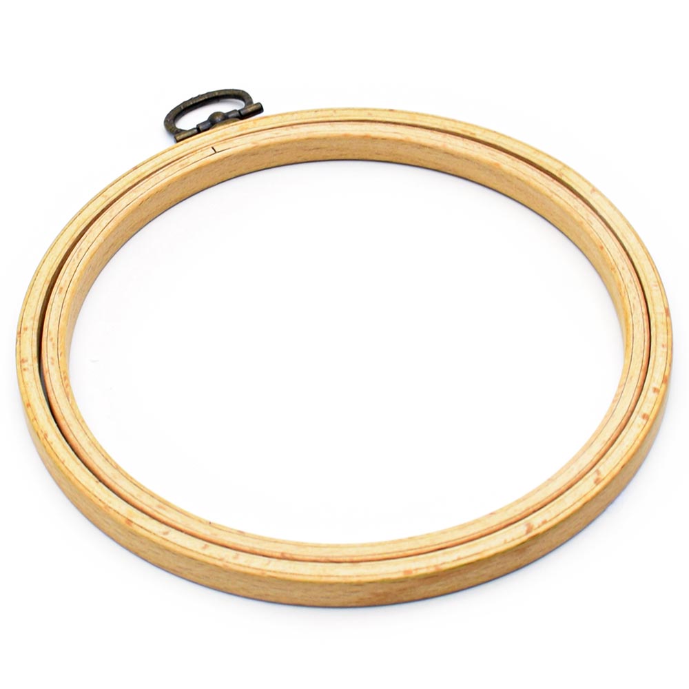 Destaque para o pingente metálico fixo na parte superior, que permite pendurar a peça finalizada como item de decoração. A madeira tem acabamento liso e tom natural, combinando com diversos estilos de bordado e ambientes.