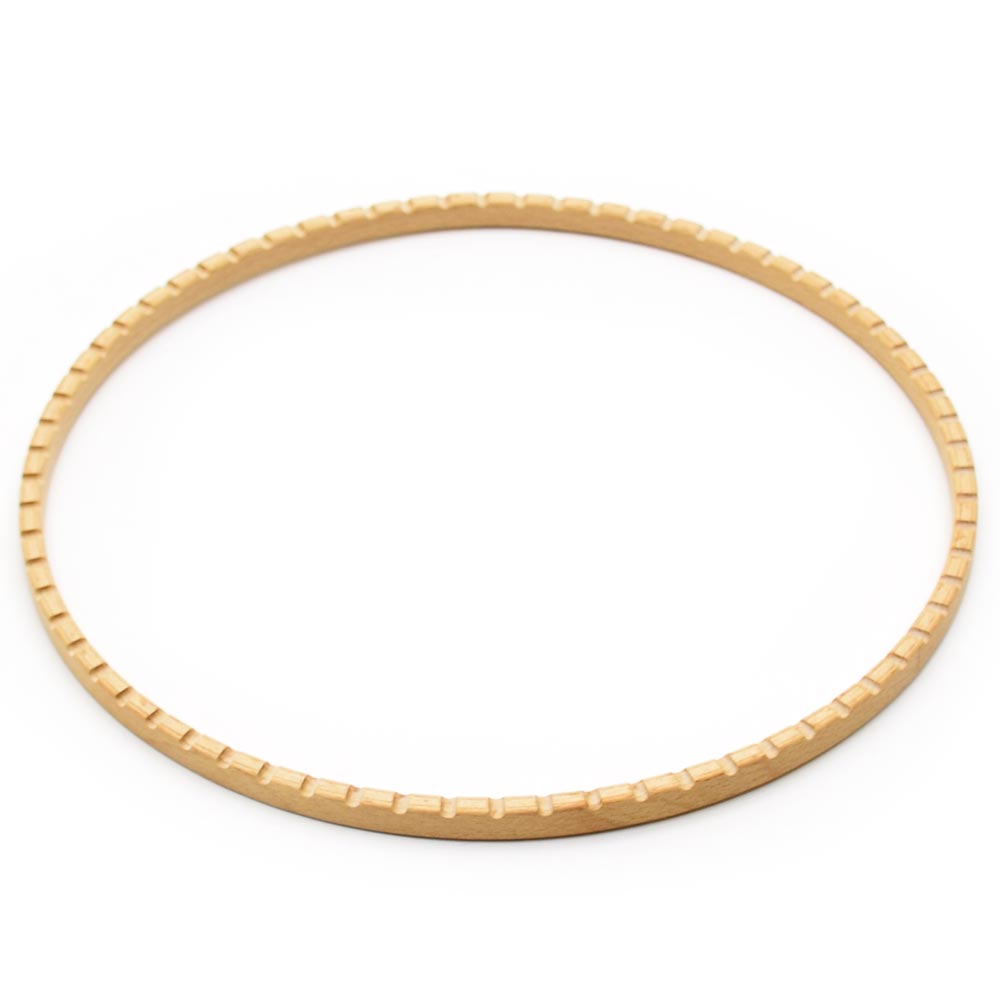 Ideal para projetos de tecelagem circular, este bastidor de madeira com 21 cm de diâmetro conta com 69 entalhes milimetricamente espaçados em toda a borda externa. Esses entalhes funcionam como guias para os fios de urdume, permitindo uma distribuição precisa e organizada, essencial para trabalhos como mandalas, painéis e arte em fios.