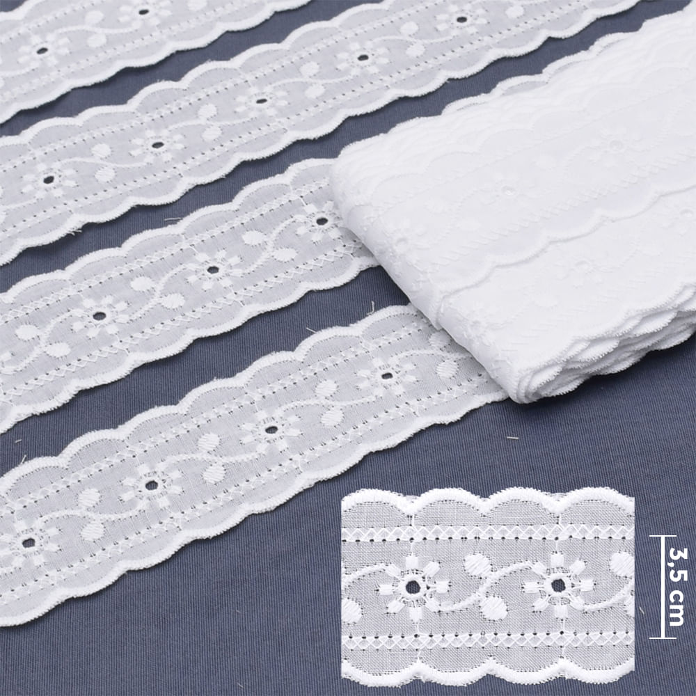 O Bordado Inglês de Algodão 3,5cm Círculo 486949 Branco é ideal para quem deseja um acabamento delicado e cheio de personalidade. Seu desenho floral vazado, com detalhes simétricos e borda ondulada, proporciona um visual romântico que valoriza qualquer criação artesanal.