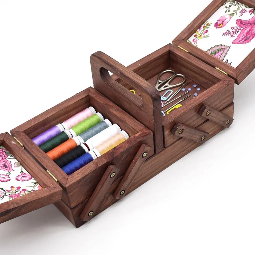 Feita com madeira de alta qualidade, esta caixa organizadora irá te ajudar muito! Com duas camadas de armazenamento em cada lado, ela se torna ótima para guardar linhas, botões, agulhas, zíperes, tesouras, kits de costura e muito mais.