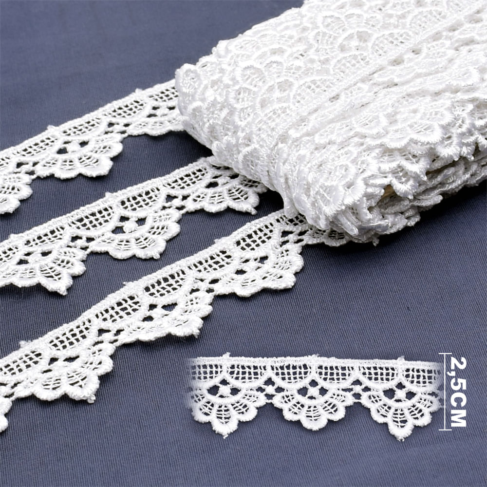 O Guipir GP048 Branco é uma renda clássica e delicada, ideal para acabamentos suaves e elegantes. Com 2,5 cm de largura, possui um desenho rendado bem definido, com vazados harmoniosos e bordas suaves, sendo perfeito para aplicações em roupas, peças infantis, enxovais, artesanato e itens de decoração.