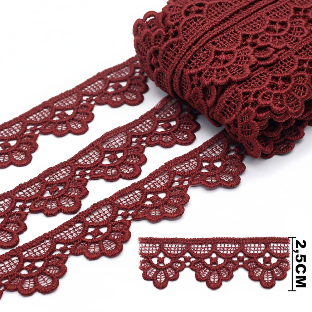 O Guipir GP048 Marsala é uma renda elegante e sofisticada, ideal para acabamentos delicados que pedem um toque refinado. Com 2,5 cm de largura, apresenta um desenho rendado bem definido, com vazados harmoniosos e bordas suaves, sendo indicado para aplicações em roupas, enxovais, artesanato e itens de decoração.