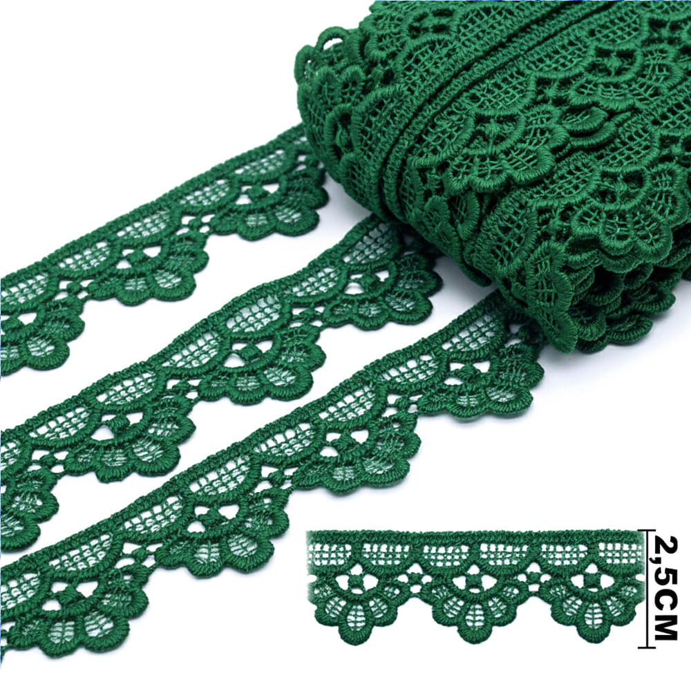 O Guipir GP048 Verde Esmeralda é uma renda elegante e marcante, ideal para acabamentos delicados que precisam de destaque. Com 2,5 cm de largura, possui um desenho rendado refinado, com vazados bem definidos e bordas suaves, indicado para aplicações em roupas, enxovais, artesanato e itens de decoração.