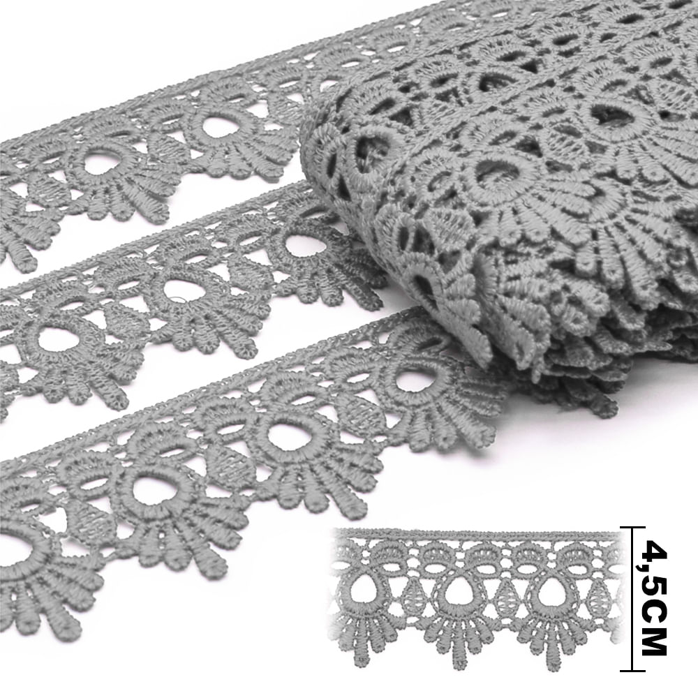O Guipir GP068 Cinza Claro é uma renda versátil e elegante, ideal para acabamentos modernos e sofisticados. Com 4,5 cm de largura, apresenta um desenho ornamental detalhado, com vazados bem definidos e bordas rendadas que valorizam aplicações em peças de moda, artesanato e decoração.