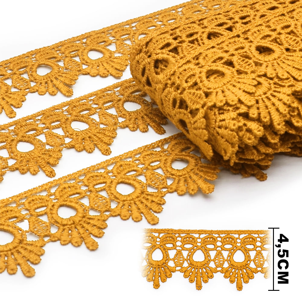O Guipir GP068 Dourado é uma renda sofisticada e cheia de presença, ideal para acabamentos que pedem destaque e elegância. Com 4,5 cm de largura, apresenta um desenho ornamental rico em detalhes, com vazados bem definidos e bordas rendadas que valorizam peças de moda, artesanato e decoração.