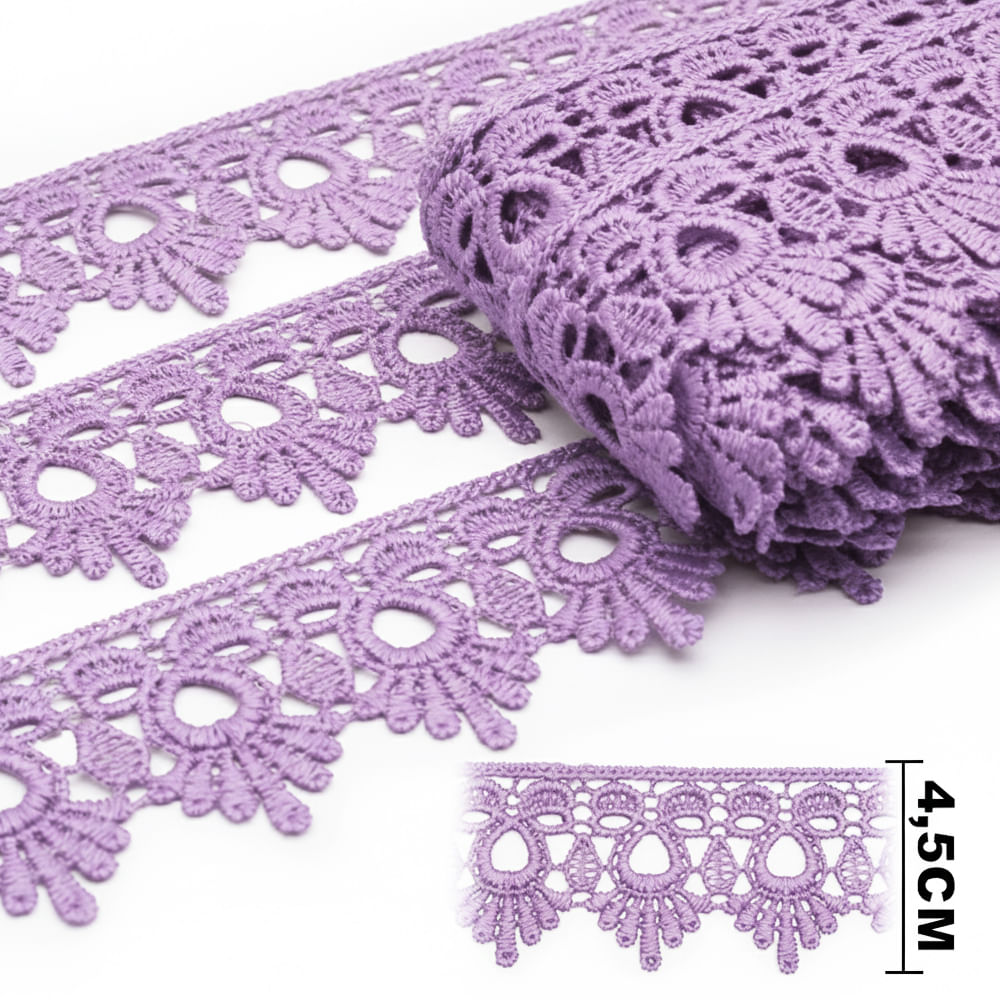 O Guipir GP068 Lilás é uma renda delicada e elegante, perfeita para quem busca um acabamento suave com um toque de cor. Com 4,5 cm de largura, apresenta um desenho ornamental rico em detalhes, com vazados bem definidos e bordas rendadas que valorizam aplicações em moda, artesanato e decoração.