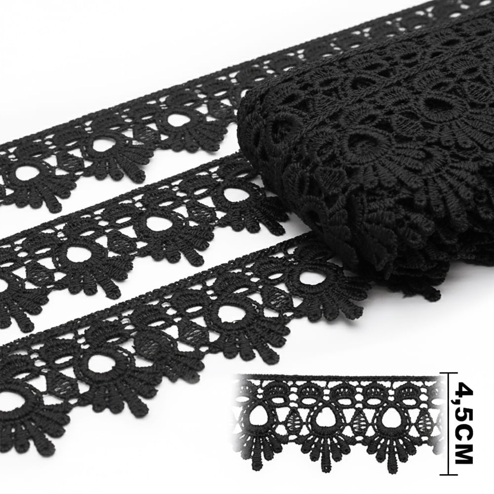 O Guipir GP068 Preto é uma renda clássica e sofisticada, ideal para quem busca um acabamento marcante e elegante. Com 4,5 cm de largura, apresenta um desenho ornamental detalhado, com vazados bem definidos e bordas rendadas que valorizam aplicações em moda, artesanato e decoração.
