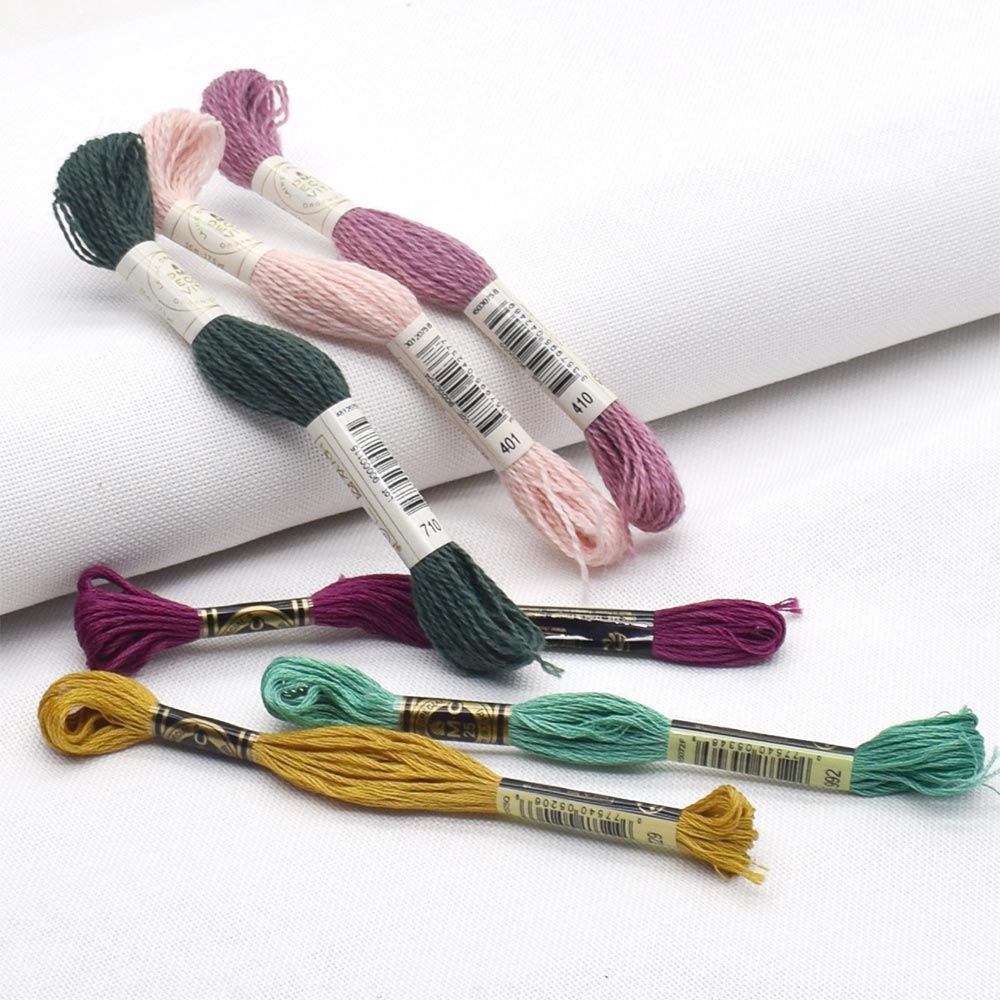 Acompanha fios da linha DMC Eco Vita – 100% lã orgânica nas cores 401, 410 e 710, que trazem uma aparência natural e textura suave ao bordado. Complementando, o kit também vem com meadas DMC Mouliné Spécial de 8 metros nas cores 0992, 3803 e 0729, conhecidas pela sua maciez e brilho sutil que realça os pontos.