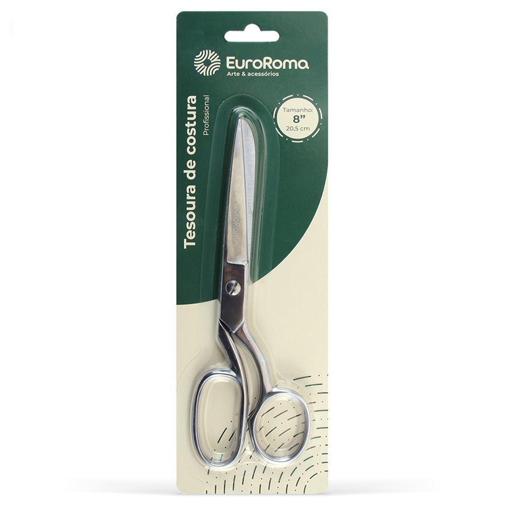 Tesoura de Costura EuroRoma em Inox ideal para cortes precisos em tecidos, fios e diversos materiais utilizados no artesanato e na costura. Seu formato foi desenvolvido para proporcionar firmeza e controle, facilitando o uso tanto em trabalhos detalhados quanto em cortes maiores.